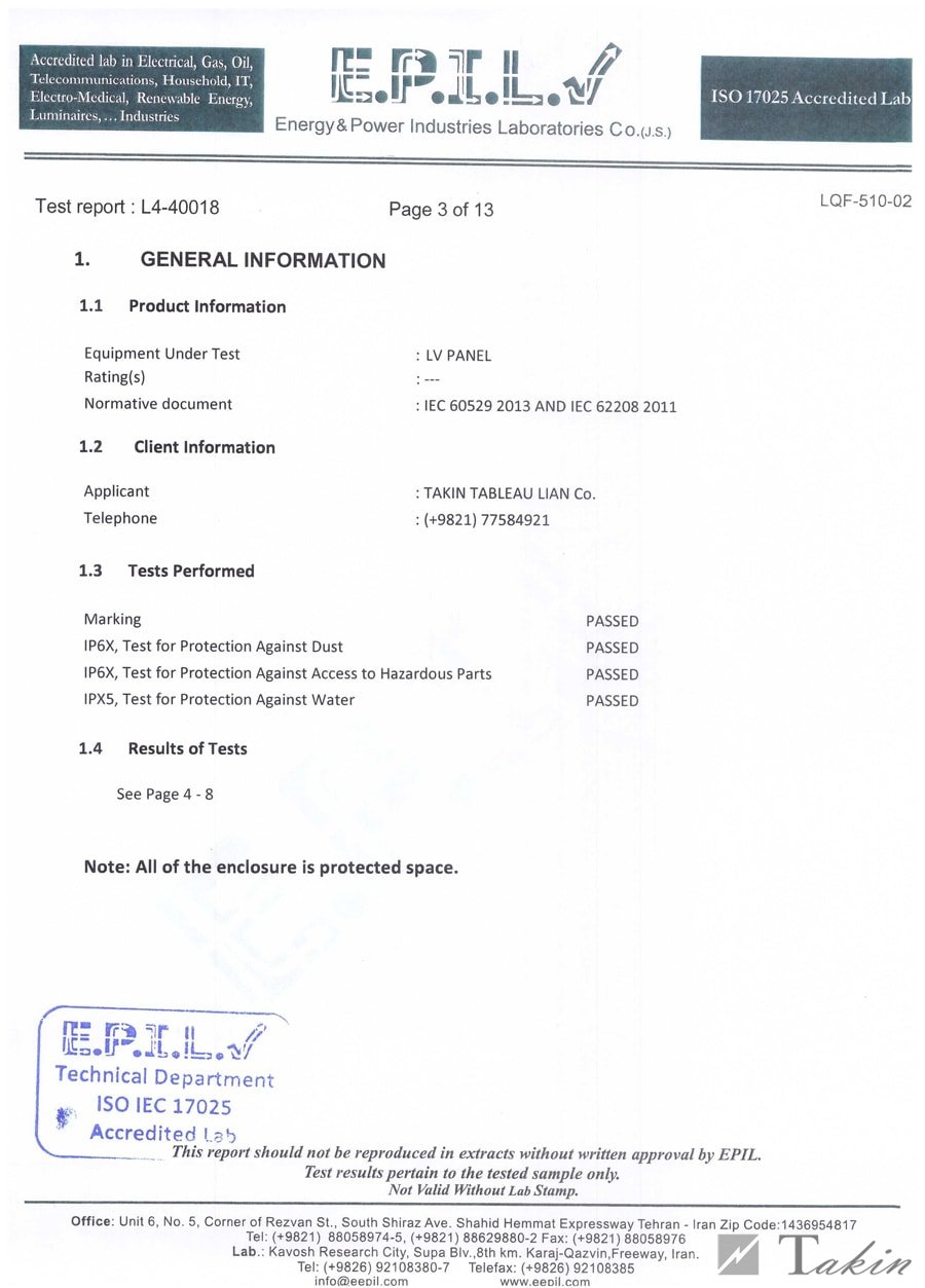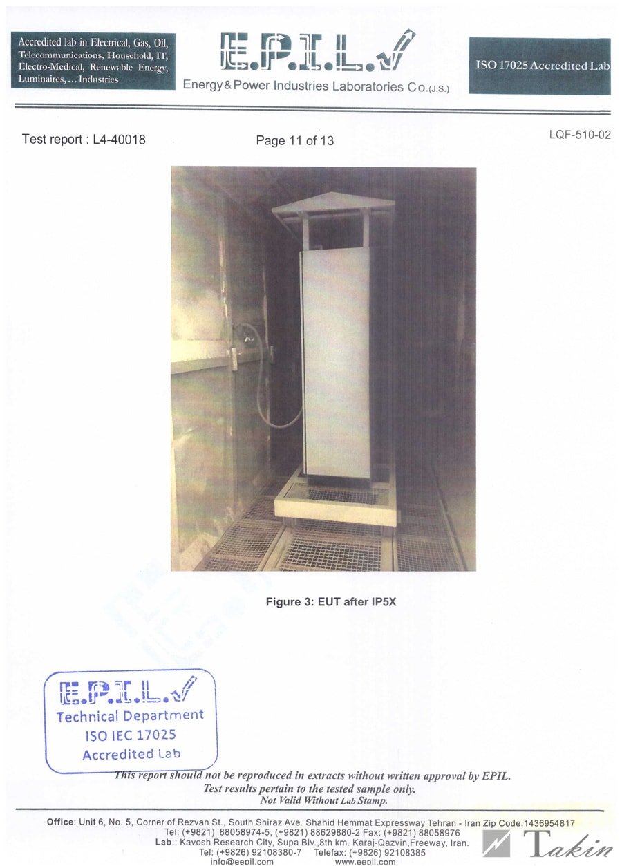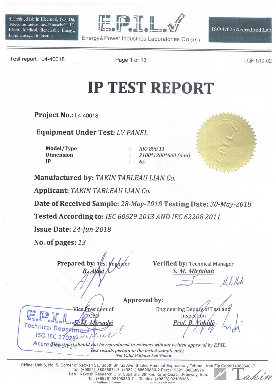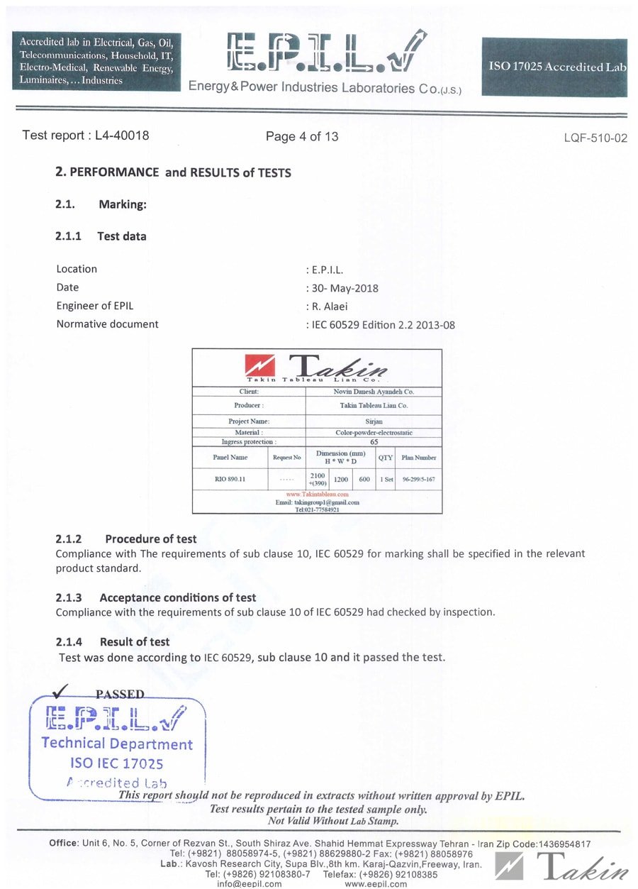 شرکت تکین تابلو موفق به اخذ گواهینامه IP65 در زمینه تابلوهای ایستاده بارانی – غیر پروفیلی شرکت نوین دانش آنیده از آزمایشگاه صنایع برق – EPIL شده است . گواهی تست درجه حفاظت 66 آزمایشگاه صنایع برق
