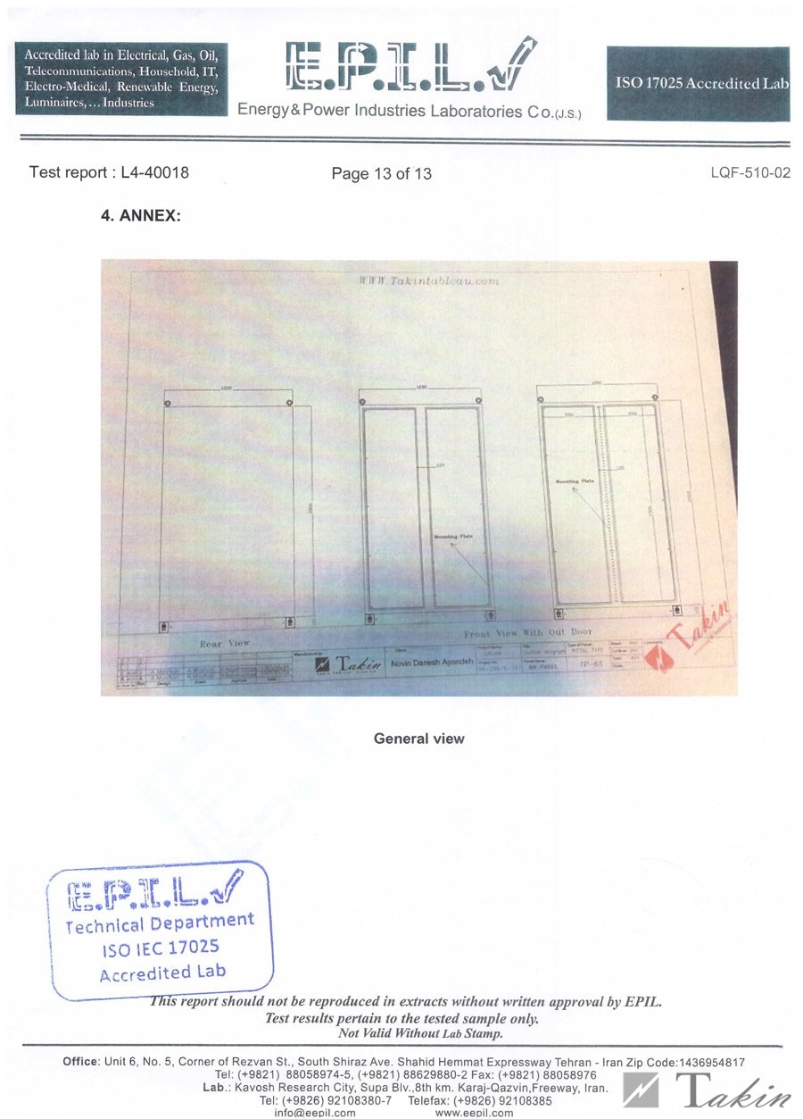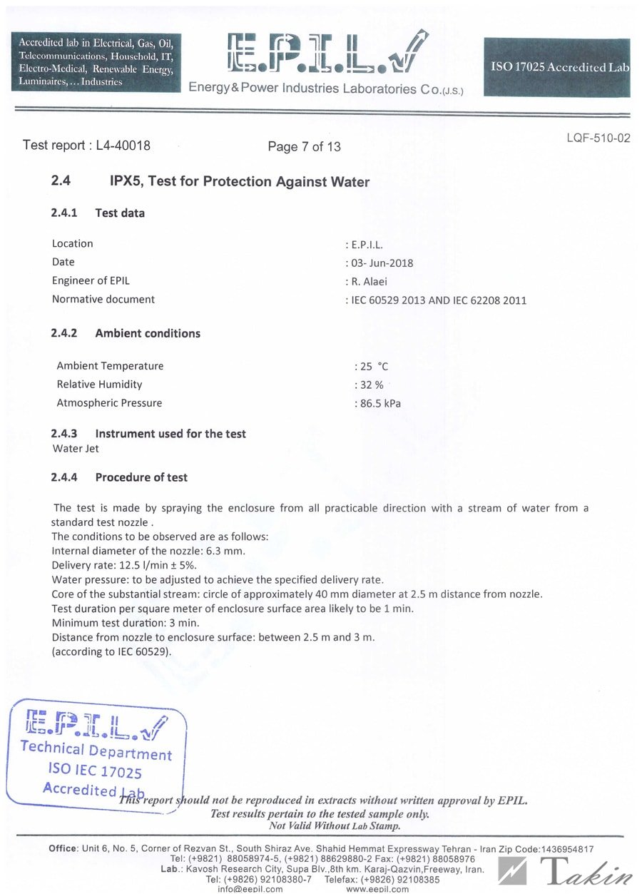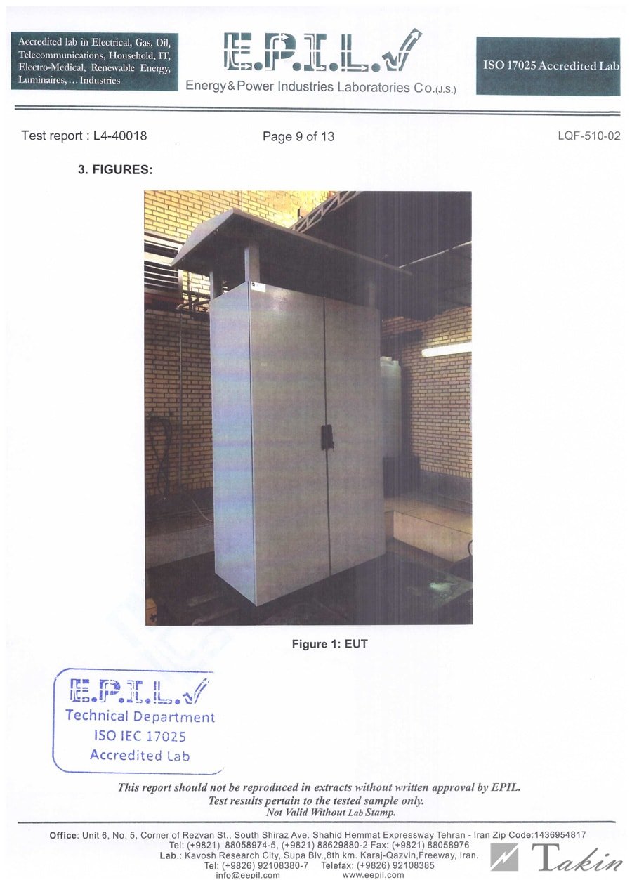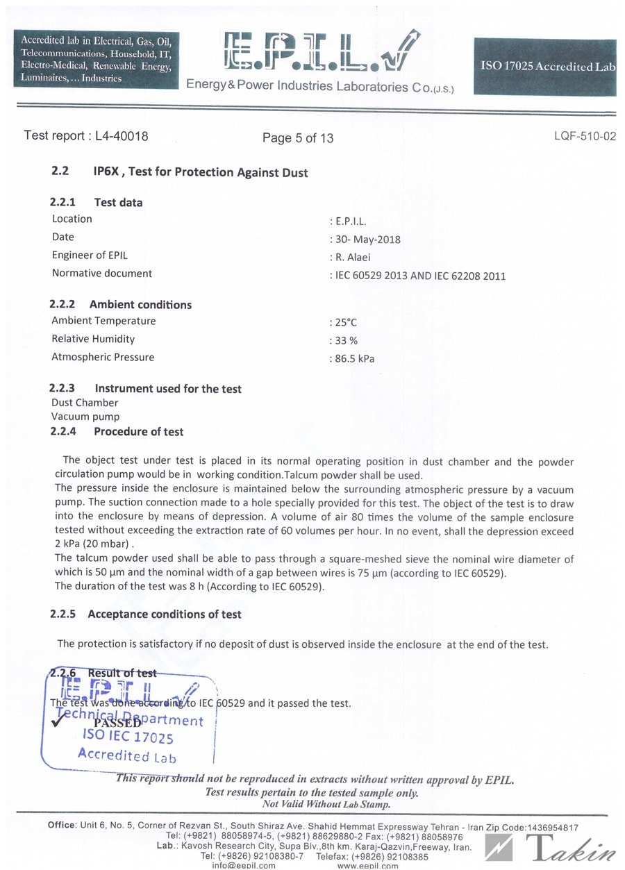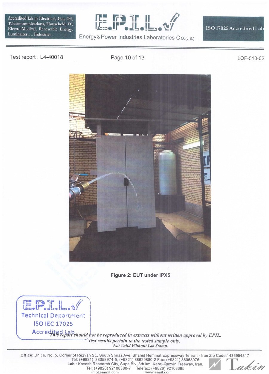 شرکت تکین تابلو موفق به اخذ گواهینامه IP65 در زمینه تابلوهای ایستاده بارانی – غیر پروفیلی شرکت نوین دانش آنیده از آزمایشگاه صنایع برق – EPIL شده است . گواهی تست درجه حفاظت 66 آزمایشگاه صنایع برق