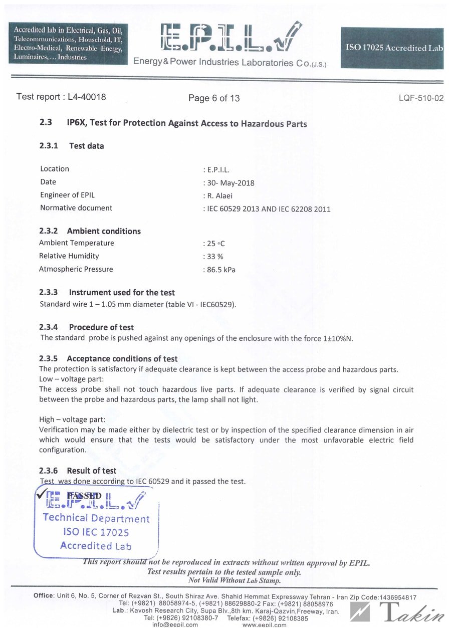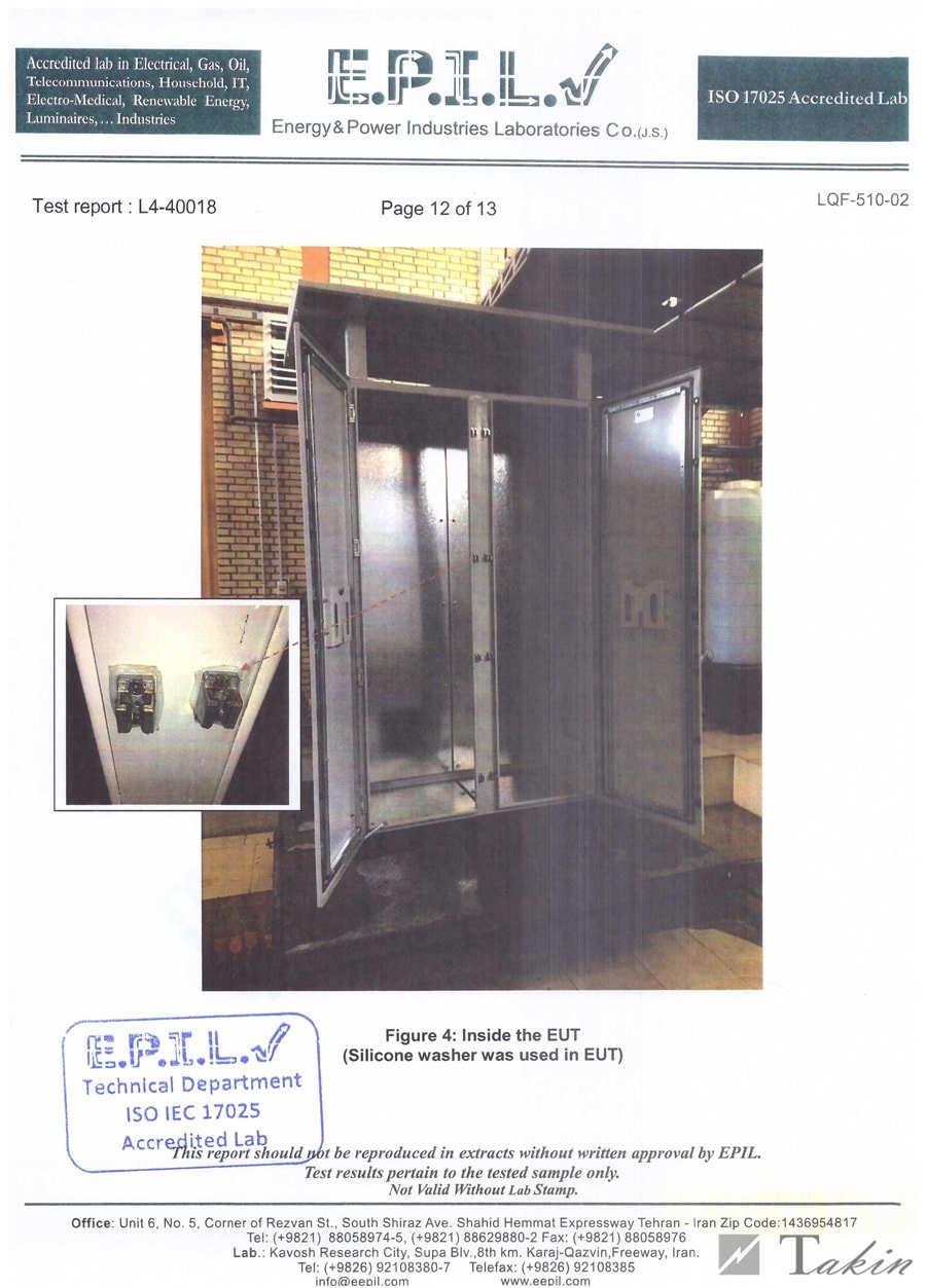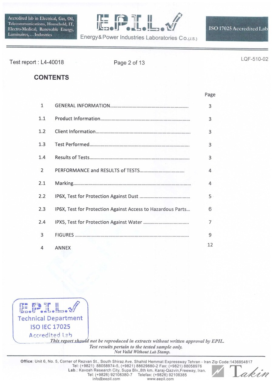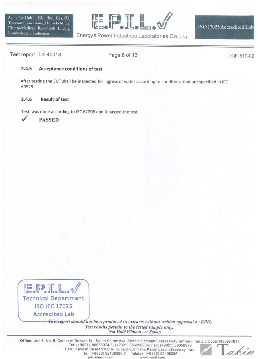 شرکت تکین تابلو موفق به اخذ گواهینامه IP65 در زمینه تابلوهای ایستاده بارانی – غیر پروفیلی شرکت نوین دانش آنیده از آزمایشگاه صنایع برق – EPIL شده است . گواهی تست درجه حفاظت 66 آزمایشگاه صنایع برق